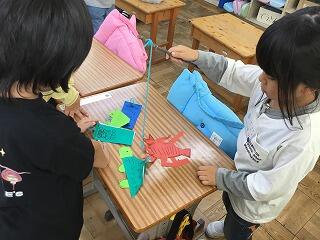 先日、1年生がみかも山にどんぐりや落ち葉を拾いに行きました。それらを使って、秋のおもちゃづくりを行いました。