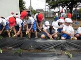 1人1本苗をもらい、うねに穴をあけて優しく土をかけ、最後に水まきをしました。一つ一つの苗にしっかり水やりをしたのですが、先週の暑さでややぐったりした苗の様子に子どもたちも心配していました。