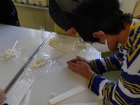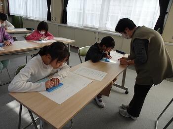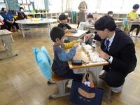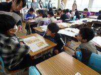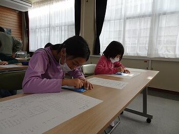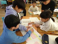 始めて点字を打つ児童でしたが、自分の名前や簡単な言葉などを丁寧に点字に起こすことができました。丁寧に教えていただけたのでやり方がよく分かったようです。また、点字の本やソースのキャップなど、身近なところに点字が使われている製品が多いと気付くことができました。お忙しい中来校してくださった皆様、ありがとうございました。