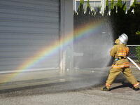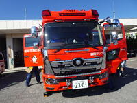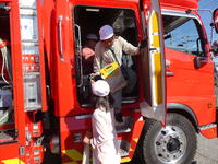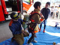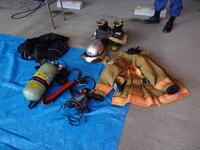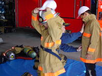 消防署の仕事をDVDで学んでから、分署内の見学、服の試着、車の説明、放水の実演も見せていただきました。火災の防護服は、酸素ボンベを背負うと歩くのも大変でした。ていねいに説明をしてただき、隊員のみなさんが普段から大変な仕事をされていることを体感できました。