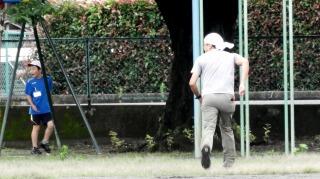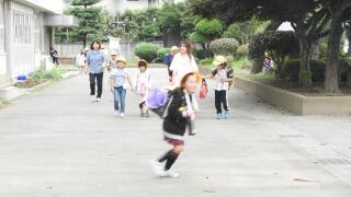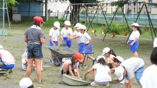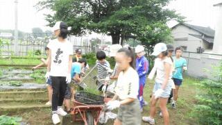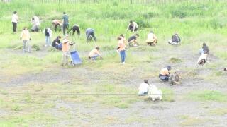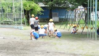 校庭に伸びる雑草。それに挑む技能員の尾林さんと、校庭掃除の子どもたち。
