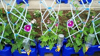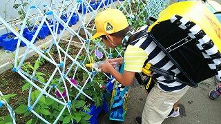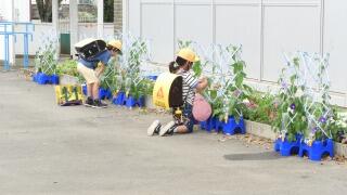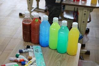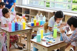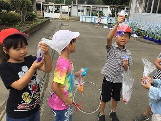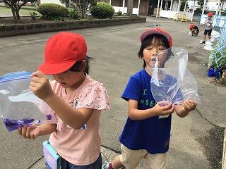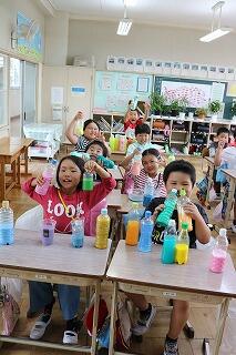今日の生活科は、「みずであそぼう」です。空容器を使った水鉄砲や、うちわの骨やストローのシャボン玉、アサガオの花で色水作りを行いました。
