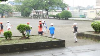 昼休み、水たまりのたくさん残る校庭に出て子どもたちと一緒に遊ぶ先生方。アクティブです。