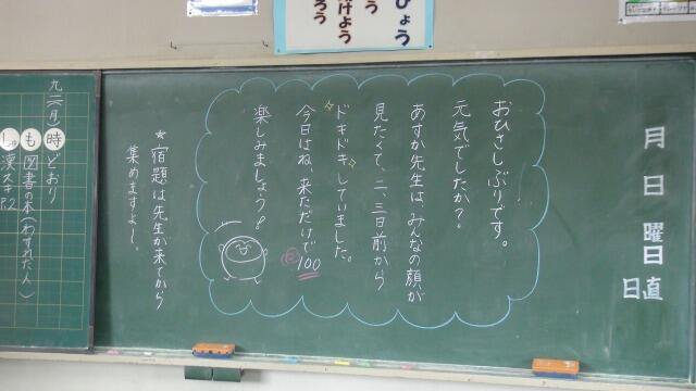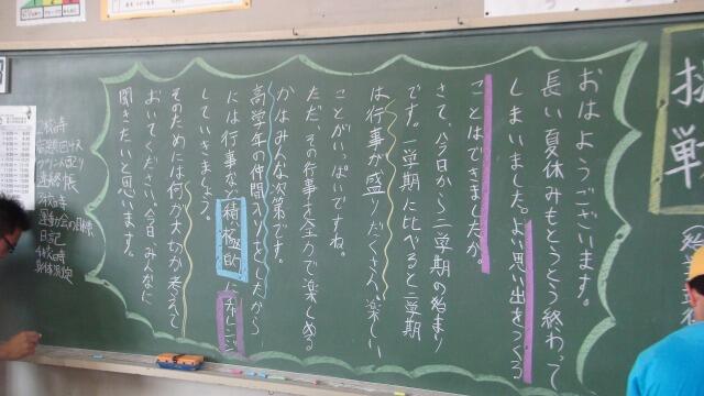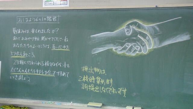 2学期が始まりました。各教室の黒板には各担任の先生のメッセージが書かれていました。