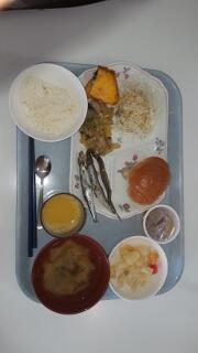 メニューは、減量アップルパン、牛乳、ちくわの磯辺揚げ、茎わかめサラダ、冷やしうどんです。