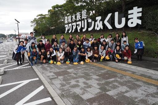 アクアマリンふくしまの目の前にあるイオンモールは、東日本大震災の経験を生かし、「一時避難ビル」としての役割も果たしています。車中から建物の構造を見学しました。