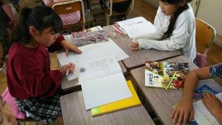 「おうちの人が、どこで買い物しているか調べよう。」というめあてで、先週から一週間、子どもたちに買い物調べの宿題を出しました。そして、今日の授業では、グループごとに統計し、棒グラフにまとめました。