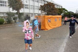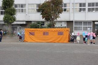 前日の準備の日に悪天候が予想されるため、地区の会長さんに確認を取って、教員だけでテントを立てました。