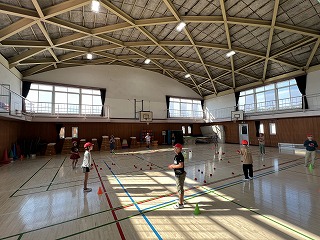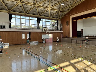 ただの玉入れではありません。注意全員が円周の線に立った位置から投げる玉入れです。算数科で「円と球」の単元で学んだ中心や半径を使って、円形のコートを作成し行いました。