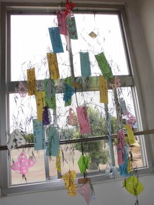 校舎内の数か所に七夕かざりの笹が置かれ、短冊に願いごとが書かれています。