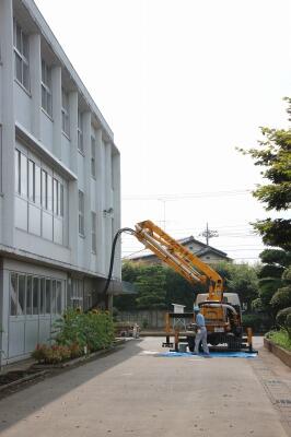 校長室前の緑のカーテン、ゴーヤ、謎の植物などは日に日に生長し、2階の窓にまで達しました。