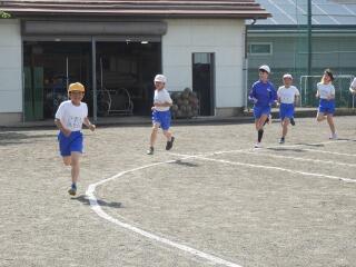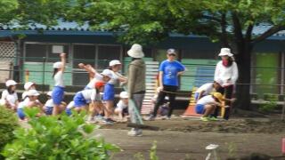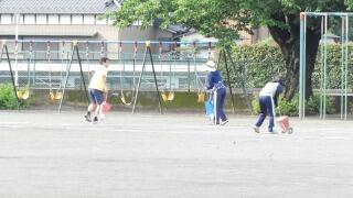 体育主任の河内先生の声かけで、早朝職員がソフトボール投げのライン引きなど行いました。