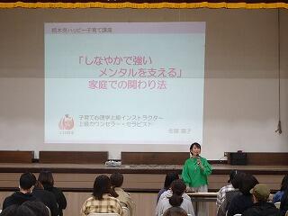 今年度は,栃木市教育委員会生涯学習課で開いている「ハッピー子育て講座(家庭教育学級)」から,子育て心理学上級インストラクターの佐藤陽子先生を講師に迎え,「『しなやかで強いメンタルを支える』家庭での関わり法」をテーマにご講話いただきました。