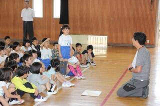 1年生を囲んで初めて今年度の全校児童の登校班ミーティングが開かれました。