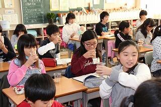 給食の時間には、体育館で少しだけ校外学習の気分を味わった1,2年生でした。