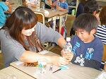 紙コップの中で、倒れてしまう浮沈子をどうしたら縦にプカプカ浮かべることができるかなと問うと、おもりになるクリップをたすといいのではないかという意見がすぐに出てきましたそこで、グループごとに実験です。アドバイスをし合いながらちょうど水面に浮くように調節することができました。簡単に作れることから「もっとつくりたい!」と2個、3個とこつをつかんですぐに作りました