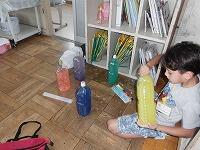 集めておいたペットボトルや透明パックに、思い思いの色水を作って楽しみました。