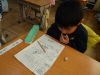 問題の意味をよ~く考えてブロックを動かしたり、式を立てたり。丸がもらえるまで、みんなあきらめずに何度も挑戦することができました