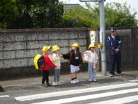 横1列に並んで待つ。青信号になったら、「右、左、右。」手を挙げて横断。