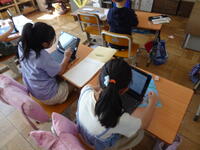 次に、タブレットを使ってデジタルの地図の航空写真から、気になる屋根の形や広い場所について、そこがどんな建物なのかを調べました。