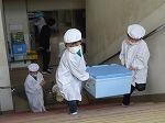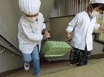 給食当番が協力して,1階の配膳室から2階の教室まで食缶やパン箱などを運びます。