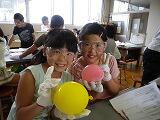 次に、ドライアイスのかけらをゴム風船に詰めてみます。子どもたちの予想は、「冷たくてゴム風船が凍っちゃうよ!」 でした。ところが、おやおや、どんどん膨らんでびっくり。ドライアイスがみるみる気化して、約700倍もの体積になりました。そこで、ドライアイスの小さなかけらをフィルムケースにとじこめると・・・パーンとはじけます。理由はおわかりですね。