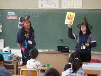 今日の外国語活動は、担任の矢津先生とALTのエイプリル先生が仮装して登場