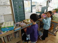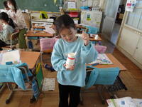 最後に、2年生から1年生へプレゼントを渡しました。心を込めて作った中で、一番よく跳ぶ「パッチンジャンプ」です。また、松ぼっくりで作ったクリスマスツリーも渡しました。1年生から笑顔で「ありがとう。」と言われた2年生たちは、とてもうれしそうでした。
