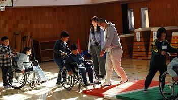 車椅子体験では、ニ人一組になり体育館の中に用意してくださった様々な障害物を避けたり、車椅子に乗ったまま段差を越えたりする体験を行いました。普段歩いている時には障壁と思わなかったことも、車椅子に乗った状態だと大きな壁になることに気付いたようです。