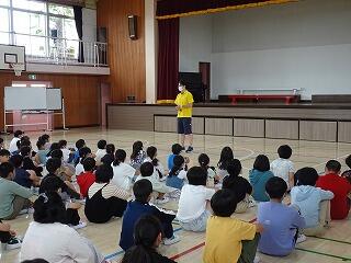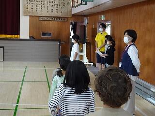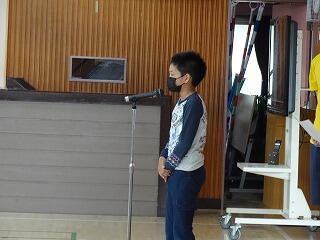 今日はあいにくの雨でしたので、体育館で、校長先生、体育主任の岡先生から話を聞いたあと、各学年の代表児童が今年度の水泳学習の目標を発表しました。