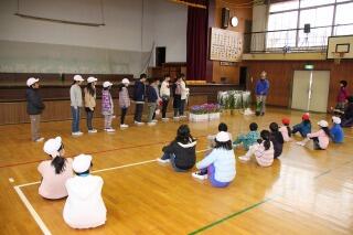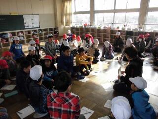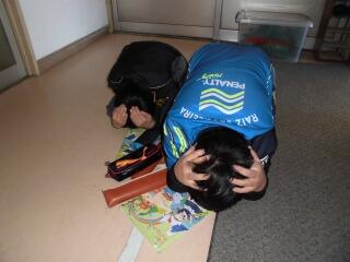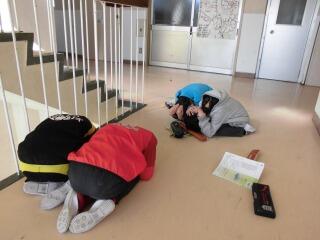 事前に、安全な避難場所や階段等では座ること、校庭では校舎から離れた位置で座ることは児童ち指導してあります。