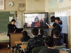 3名の藤岡第一中学校の1年生は、動画、教科書やノート、体操服の実物などで中学校での生活の様子について、優しく分かりやすく説明してくれました。