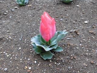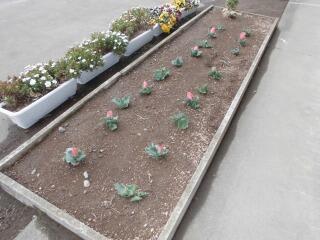 校長室前の花壇に赤いチューリップの花が開き始めました。