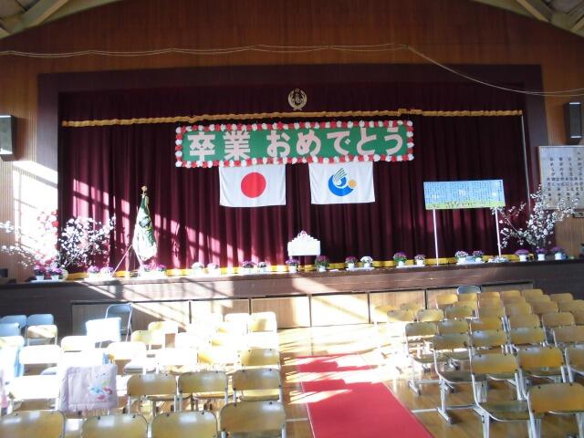 西階段の踊り場には「卒業おめでとうございます」の横看板が、玄関には祝電が置かれています。