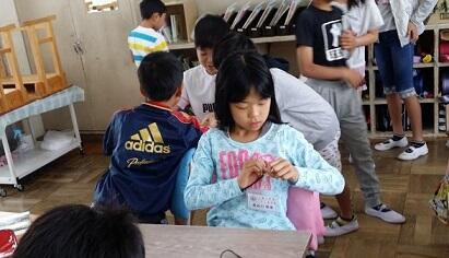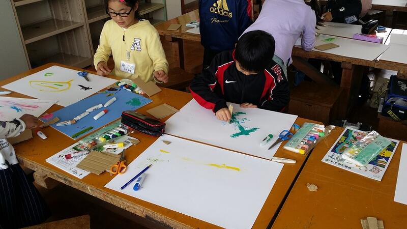 図工の時間で、ダンボールや自分の手やストローを使った作品作りに挑戦しました。