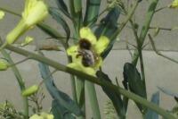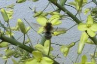 校長室前の花壇に咲いているキャベツの花にミツバチが3匹集まってきました。