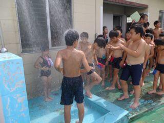 6年生を中心に準備運動をしたら、プールサイドに行き、念入りにシャワーで体を洗います。
