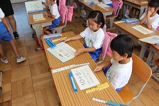 『10より大きいかず』のたし算・ひき算の問題を、「かずのブロック」を動かしながら計算して解いていく授業でした。指先をぴんと伸ばして手を挙げて意見を発表したり、自分で考えた解き方をペアの友達に一生懸命説明したりと、活発なすばらしい授業態度でした。