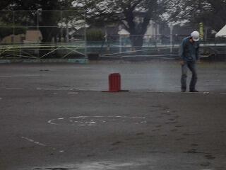 朝5:30、小雨降り続く中、校庭には水たまりの数々。