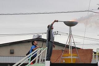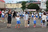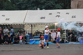 地域の皆様、PTAの方々、職員が校庭の水取などの整備をしているところ、6:00には花火が上がりました。