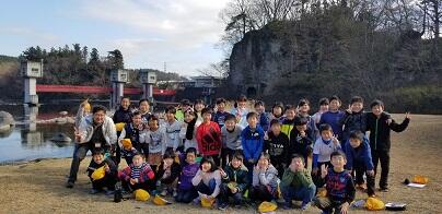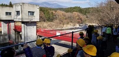 西岩崎頭首工にて。集合している子どもたちの奥に取入口が見えます。