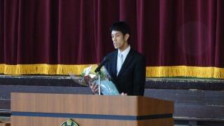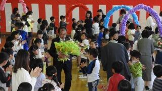 三鴨小学校を去る先生方の入場、そして児童代表お別れの言葉、花束贈呈です。