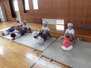 体育の途中で雨が降ってきてしまいました。帰りの用意をして、体育館で続きをすることに。