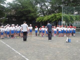 今日は1年生立ち幅跳び、2年生鉄棒とけんけんぱ、3,4年生紅白の玉投げ、5,6年生持久走でした。