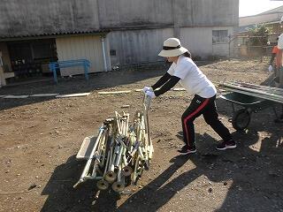 応援団が練習するさなか、体育主任は入退場門の補修をしていました。