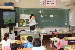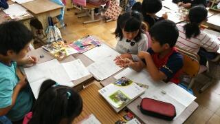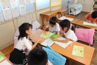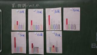 「おうちの人が、どこで買い物しているか調べよう。」というめあてで、先週から一週間、子どもたちに買い物調べの宿題を出しました。そして、今日の授業では、グループごとに統計し、棒グラフにまとめました。