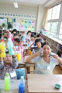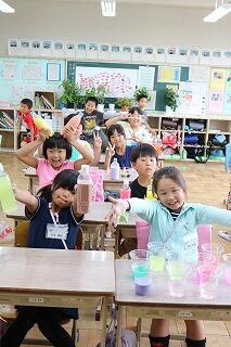 今日の生活科は、「みずであそぼう」です。空容器を使った水鉄砲や、うちわの骨やストローのシャボン玉、アサガオの花で色水作りを行いました。