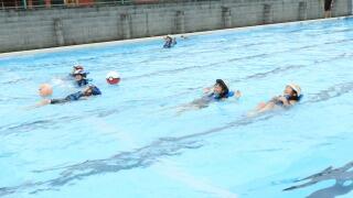 そして、プールサイドにいる友だちが投げたペットボトルを浮力にしてラッコのように浮きます。