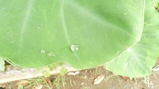 ジャガイモの白い花が咲き、カボチャの黄色い花が咲き、サトイモの葉にはきれいな水滴が乗っていました。