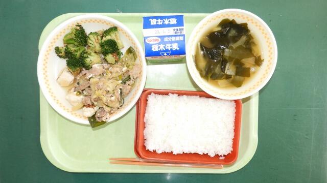 令和元年最後の給食のメニューは、ごはん、牛乳、すき焼き風煮、ブロッコリーのおかか和え、大根とわかめのみそ汁でした。